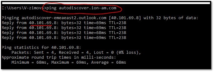 בדיקה ראשונה בתחנה בה אתה לא מצליח להגדיר את הפרופיל – Ping Autodiscover, אתה צריך לקבל תשובה מכתובת IP של מיקרוסופט, בדיקה מאצלי לדוגמא לדומיין ion-am.com :