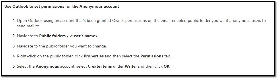 ע"מ ש- PF יוכל לקבל מיילים מנמענים חיצוניים יש לתת הרשאות CreateItems ל- Anonymous לאותו PF, אפשרות אחת דרך ה- Outlook (כמובן Outlook של משתמש עם הרשאות Owner על ה- PF):