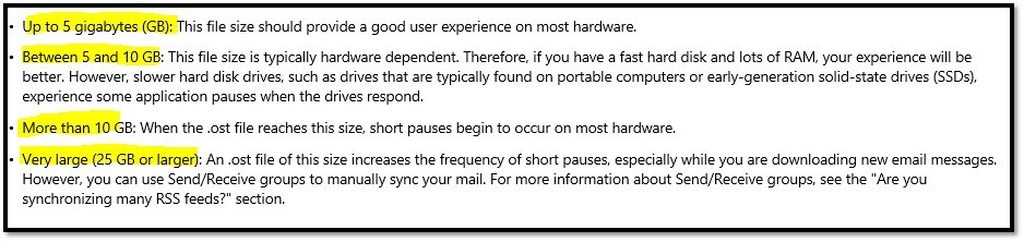 OST, מעל 10GB – קופא, נתקע, קורס. אם היא רואה מספר תיבות מייל, ותיקיות משותפות וה- Cache mode מוגדר לשנה ומעלה – סביר מאוד שהיא עוברת את ה- 10GB בקלות…