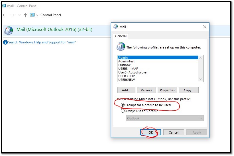 הגדרת את ה- Outlook כך שיפתח עם אפשרות לבחור פרופיל (מתוך לוח הבקרה – דואר – הצג פרופילים – הצג רשימה: