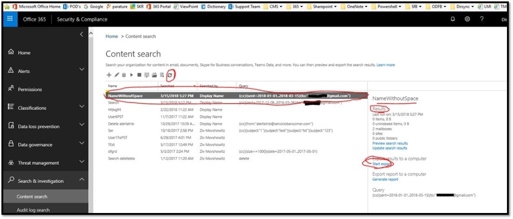 בסופו של דבר תקבל את מסך השאילתות, תוכל לעשות שם Refresh במידת הצורך ובצד שמאל תוכל לראות את התוצאות וליצא אותן כ- PST אל המחשב: